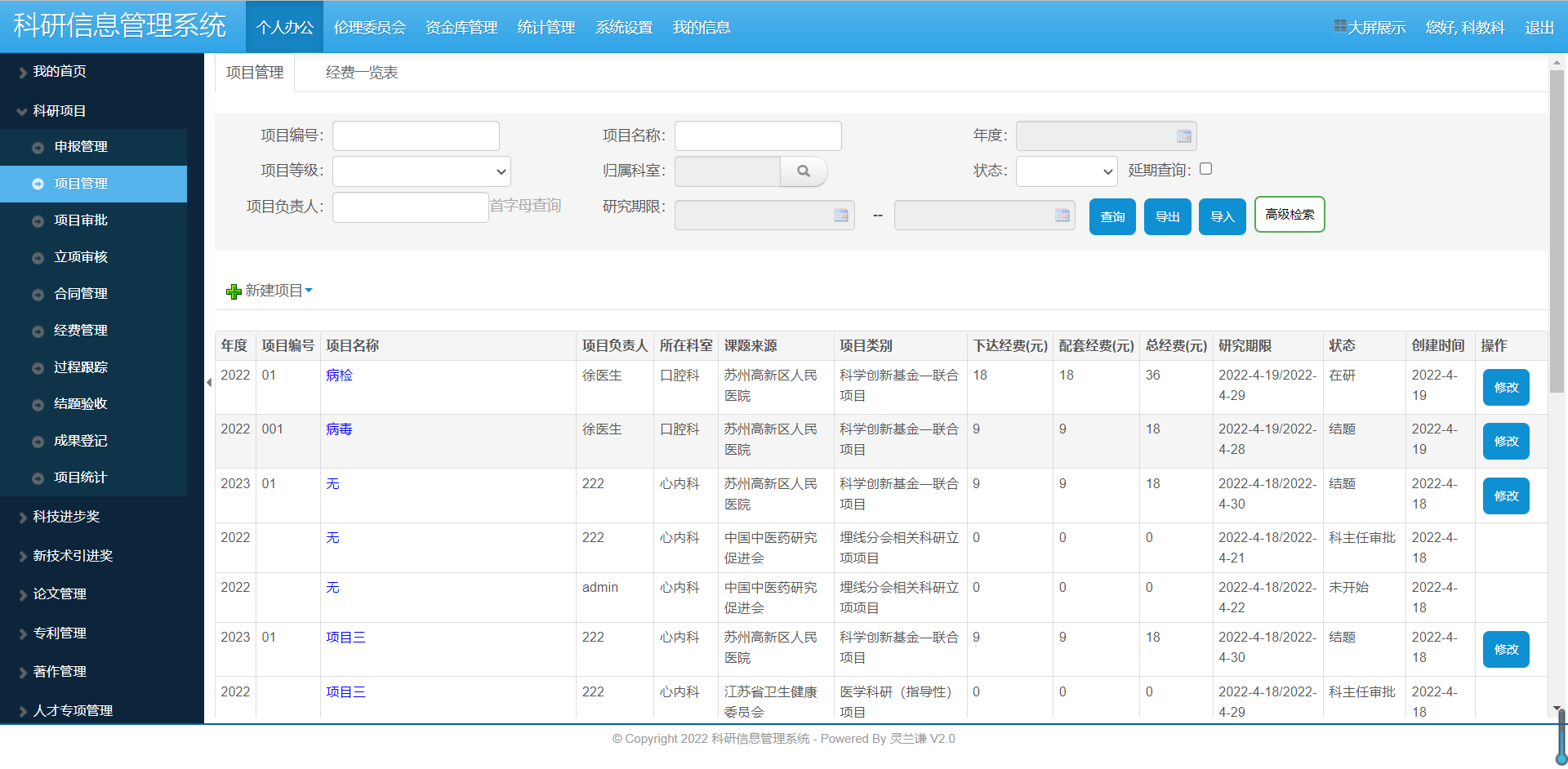 科研管理系统是基于基础数据库上,集科研项目申报、项目登记、流程审批、项目管理、经费管理、论文管理、科技进步奖申报、专利、著作、学术活动、外出进修、学会任职申请等为一体的科研管理平台。