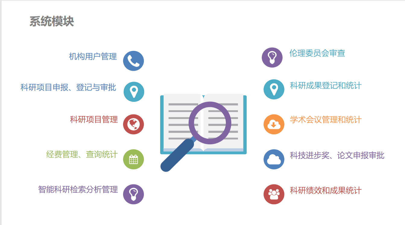 科研项目申报、审批,学术和伦理专家评审,立项, 合同管理;项目登记审核、成果登记、统计分析;科研经费管理;过程跟踪,进展反馈、结题验收、结题考核;统计管理等。